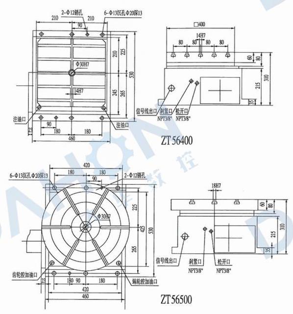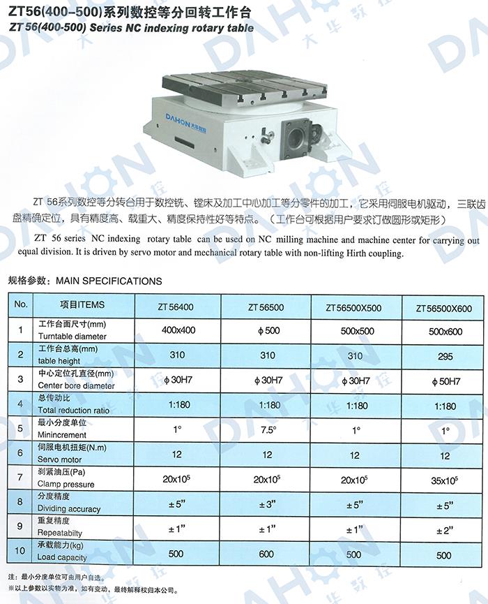 ZT56(400-500)系列數控等分轉臺用于數控銑、鏜床及加工中心加工等分零件的加工,它采用伺服電機驅動,三聯齒盤精確定位,具有精度高、載重大、精度保持性好等特點。(工作臺可根據用戶要求訂做圓形或矩形)