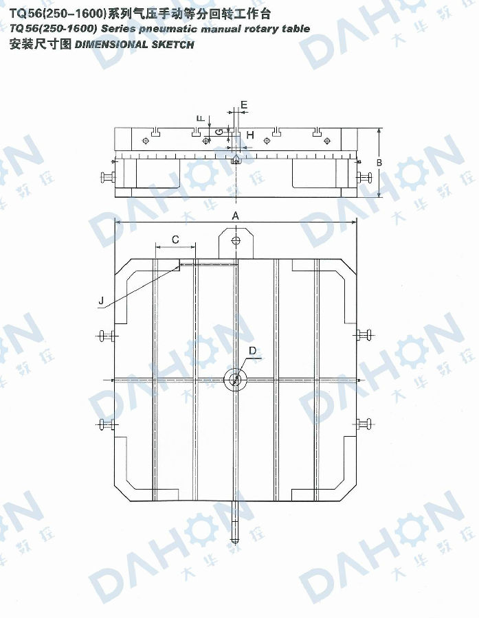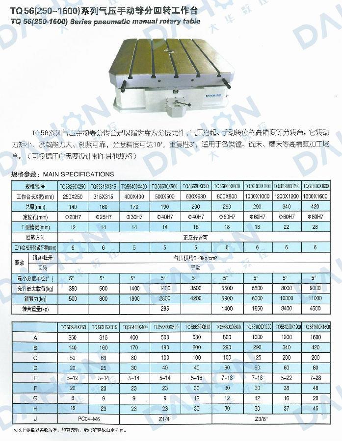 TQ56系列氣壓手動等分轉臺是以端齒盤為分度元件,氣壓抬起、手動轉位的高精度等分轉臺。它轉動力矩小、承載能力大、剎緊可靠,分度精度可達10”,重復度3”,適用于各類鏜、銑床、磨床等高精度加工場合。(可根據用戶需要設計制作其他規格)